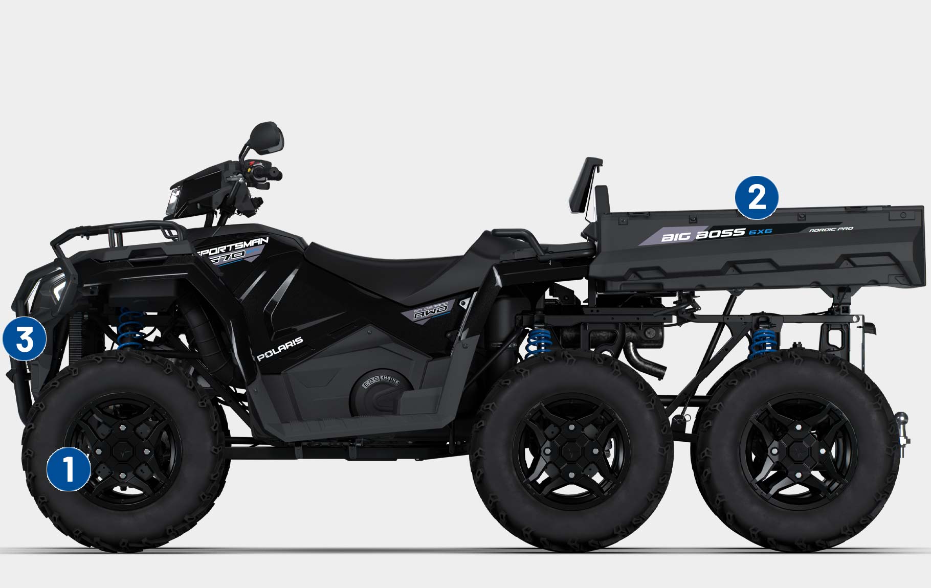 Mit seinem mutigen neuen Design, seinem verstärkten Fahrwerk und seinen optimierten 6x6-Fähigkeiten garantiert der Sportsman 6X6 570 der nächsten Generation ein ruhigeres Fahrverhalten und überragenden Komfort.